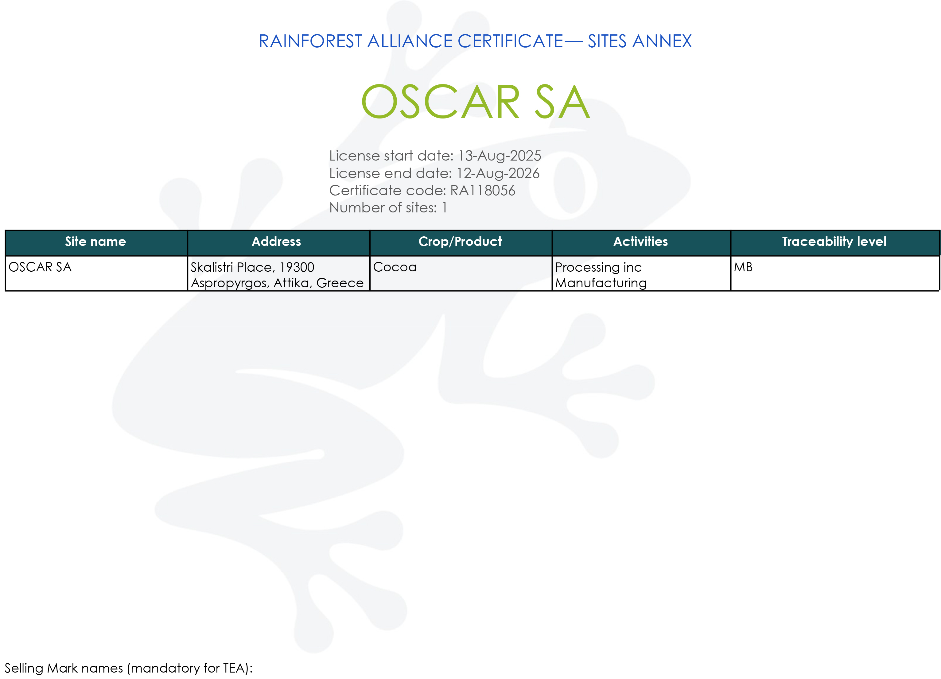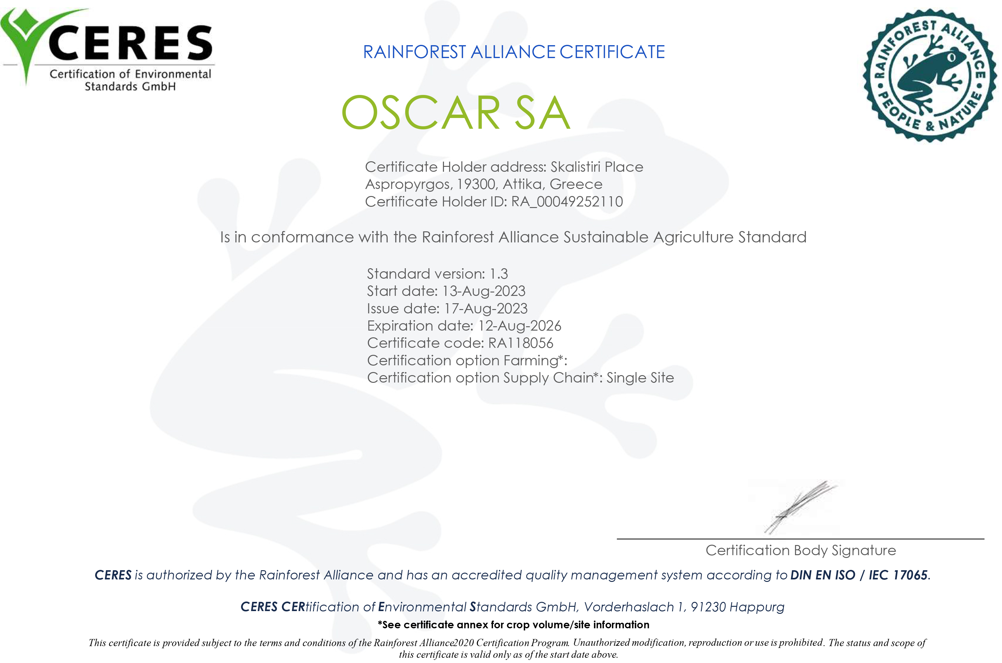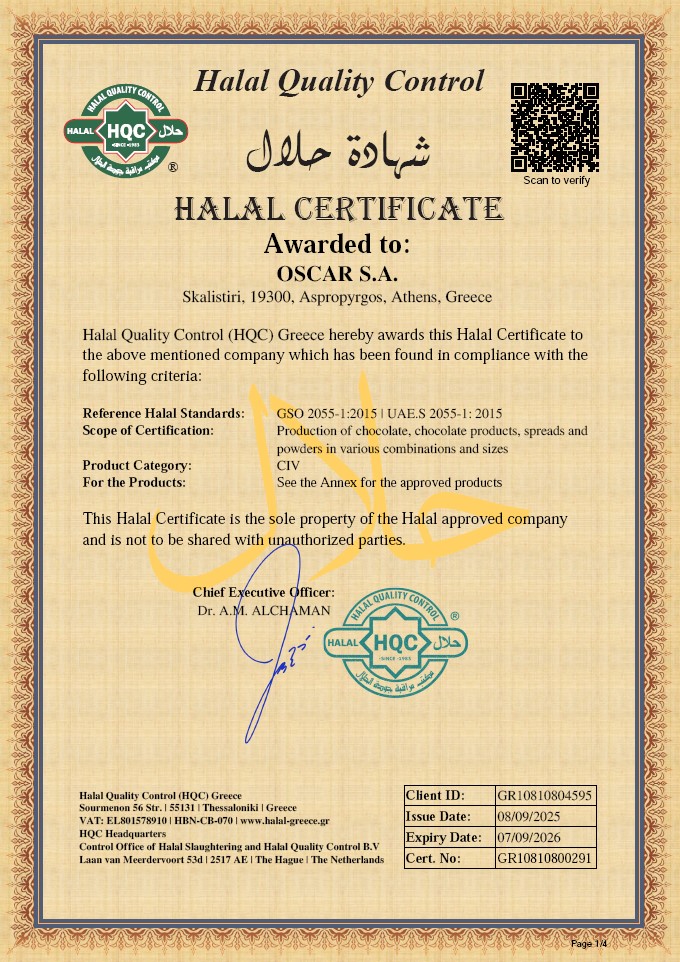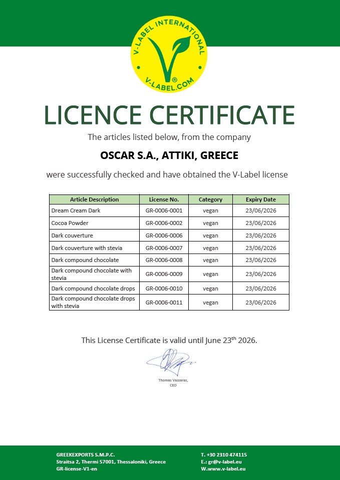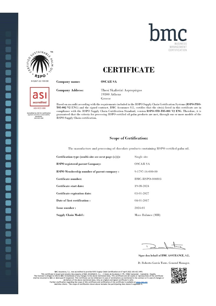 Η σοκολατοποιία OSCAR είναι πιστοποιημένη από το 2014 με τα κριτήρια της Rainforest Alliance (πρώην UTZ) και από το 2024 με τα κριτήρια του FAIRTRADE για την ιχνηλασιμότητα του κακάο που χρησιμοποιεί ως πρώτη ύλη στη παραγωγή σοκολάτας.
