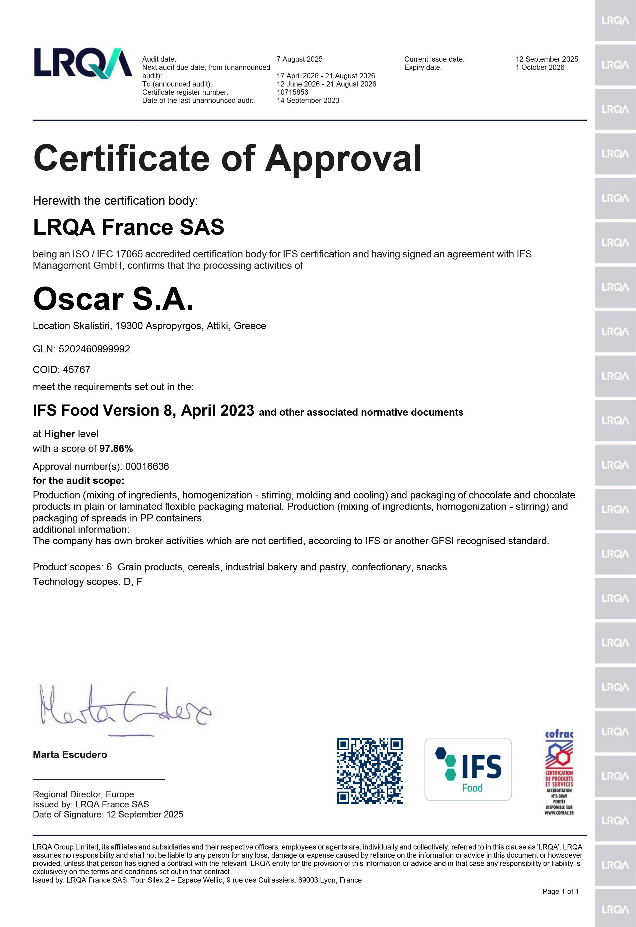 Η συνέπεια μας στην ποιότητα επιβεβαιώνεται με την πλήρη συμμόρφωσή μας προς όλες τις προδιαγραφές ποιότητας και υγιεινής. Και για να διασφαλίσουμε την ασφάλεια των προϊόντων μας, διαθέτουμε το τεχνικό πρότυπο IFS (International Food Standard) από το Lloyd's Register, καλύπτοντας την παραγωγή και τη συσκευασία μας.